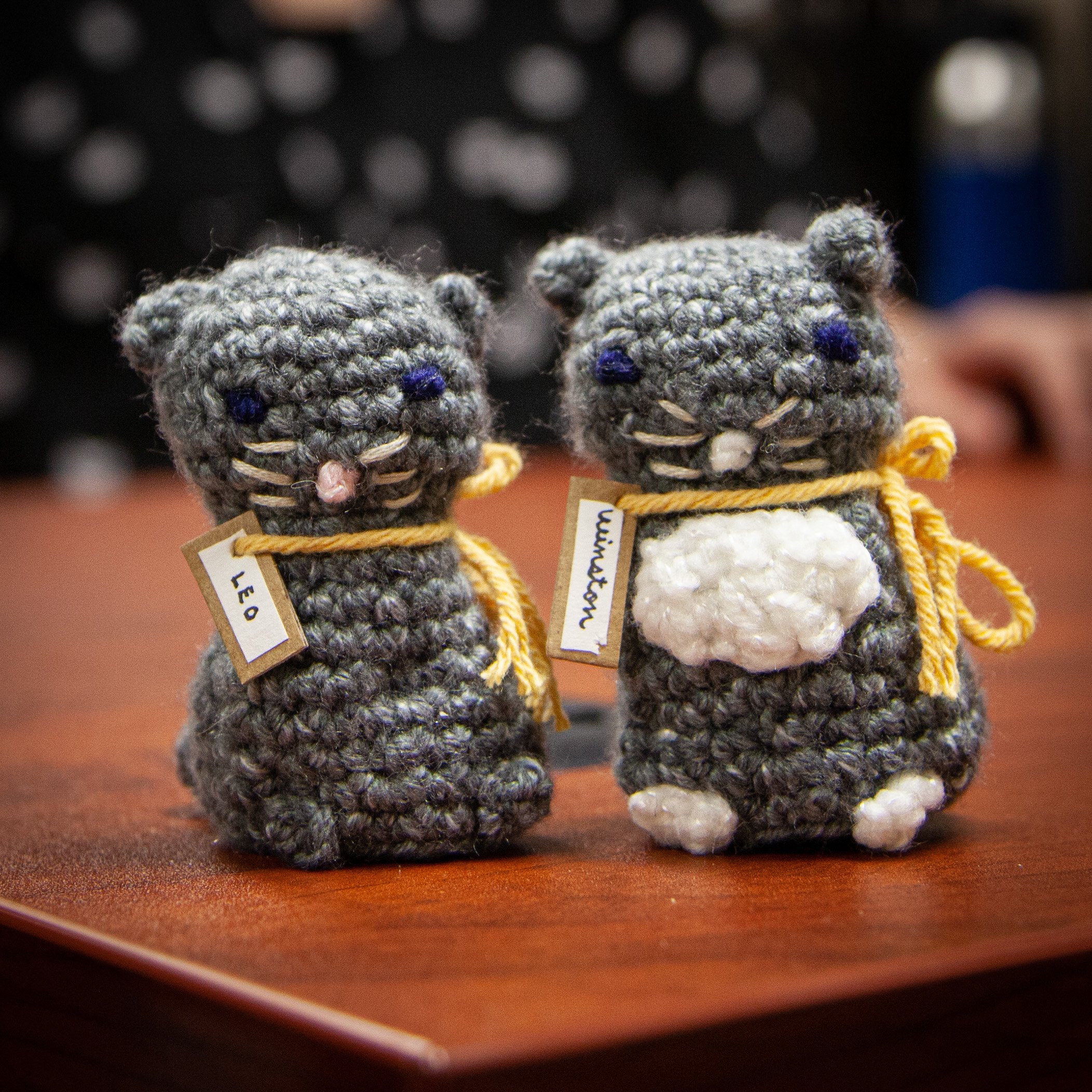 “Last year one of my students, Sarah Jocham, a flute player, started a small business making all sorts of crocheted things. I was talking to her about it, and I asked her offhandedly, ‘Have you ever made cats?’ And she said that no, she hadn’t. And then, a few weeks later, she came up to me and just casually handed me these little crocheted gray cats!